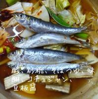 お鍋に具材とイワシを並べたら、お酢、お砂糖、そばつゆ、味醂、コチュジャン、豆板醤、お水を注ぎ入れストーブにかけます。気温の低い日が続きますので、ニンニクと生姜は多めに入れてみました。