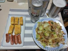 本日の昼吞みのお供は焼きそば、だし巻き玉子、ウインナーでいただきます