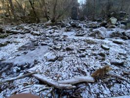 凍り着いた渓流に掛かる穴あき堰の通路から下流域を望む(╹◡╹)