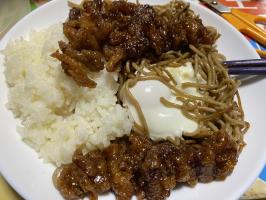 焼きそばライスに焼き鳥のとり皮をワンプレートに乗っけ盛りぃ〜(╹◡╹)
