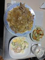 皆さんお疲れ様です今日の晩ごはんのお供は焼きうどん・はるさめサラダ・ちくわときゅうりの和え物でいただきます