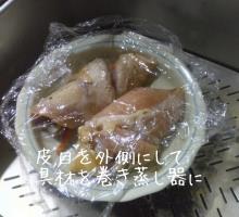 鶏むね肉を丁寧に水洗いしたら拭き取り、フライパンで具材と一緒に皮目から軽く焼きます。具材を鶏むね肉で巻いたら、軽くラップして蒸気の出ている蒸し器にセットします。