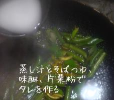 蒸し終わったら火傷に注意しつつ取り出し、切り分けます。フライパンに油を敷き、ネギを炒めたら蒸し汁とそばつゆと味醂と片栗粉でタレを作り、蒸し物にかければ完成です。