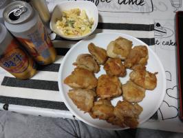 今日の晩ごはんのお供は鶏もも肉の唐揚げとマカロニサラダでいただきます
