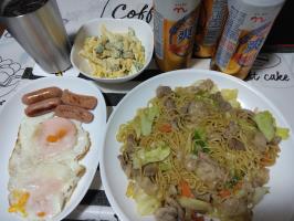 本日の朝吞みのお供はいつもの定番セット・焼きそば・マカロニサラダでいただきます